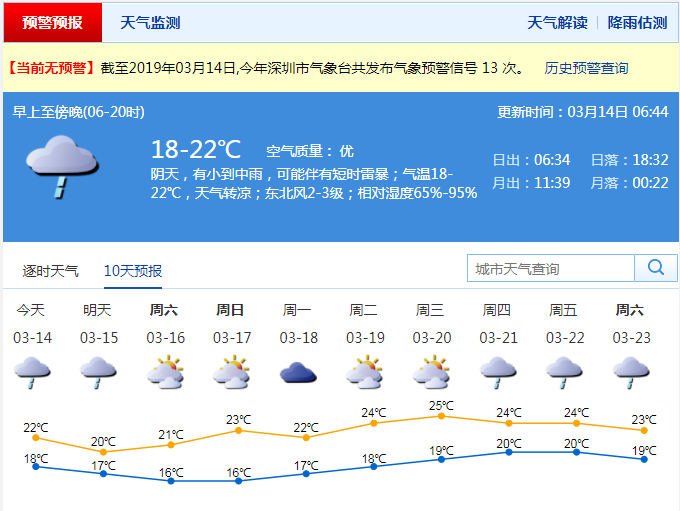 深圳新闻网2019年3月14日讯“露脸”没几天的太阳又要去“流浪”了。据深圳市气象台消息,受弱冷空气影响,今日深圳阴天为主,有分散阵雨;气温19-21℃;。早晨天气较凉,注意添衣保暖。