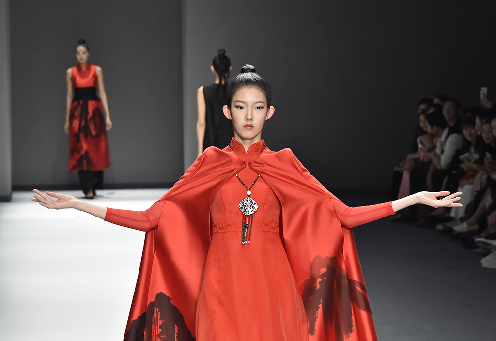 模特正在展示品牌Sunshine见花开的服装 红色的服装尽显东方美感