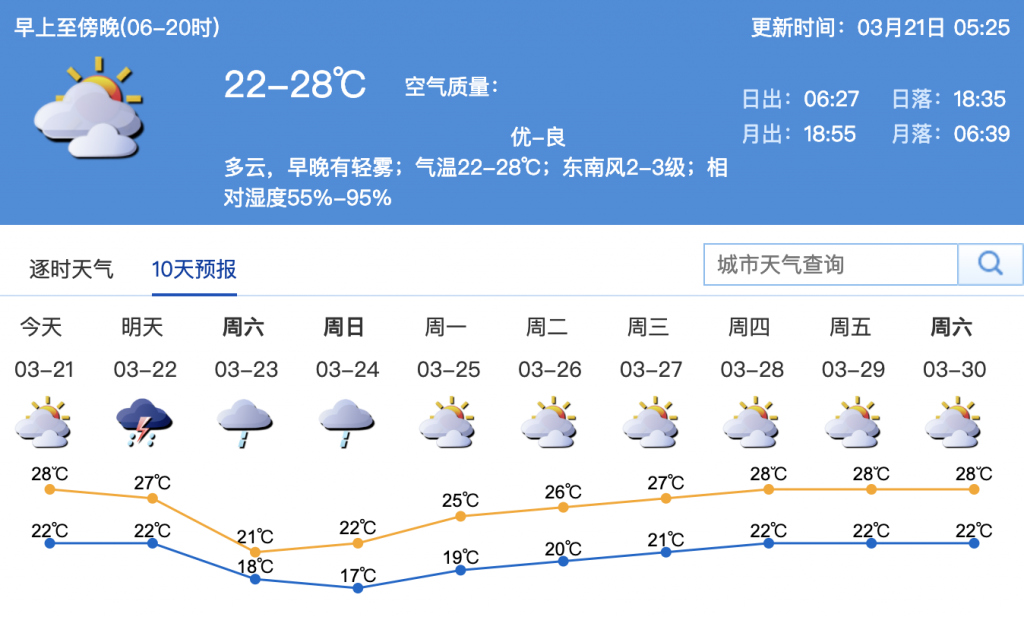 距离深圳平均入夏时间4月21日还有一个月,市民们也许已经有了初夏般的感受。预计21日多云间阴天,早晚有轻雾,气温23~28 ℃。