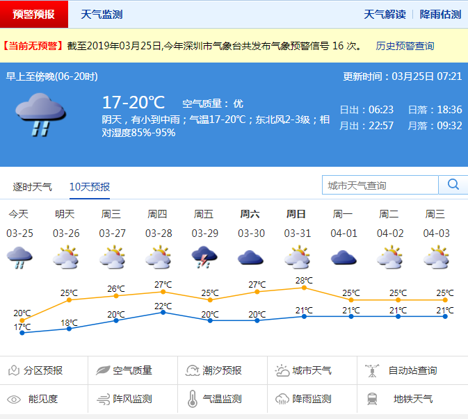 深圳新闻网2019年3月25日讯 今日仍阴凉有雨,降雨主要出现在凌晨至午后,有小雨到中雨,局部大雨,可能有零散雷暴。深圳市气象局预计26日起转多云可见阳光,气温逐日回升,27-28日暖湿有雾,最高气温可回升至25℃以上。