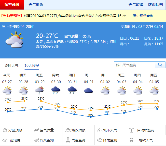深圳新闻网2019年3月27日讯 深圳今日多云,早晚有轻雾;气温20-27℃,相对湿度65%-95%;东北风2-3级。预计28日多云间晴,气温继续回升,早晚有轻雾或雾;29日多云转雷阵雨;30-31日冷空气影响,我市阴天有阵雨或雷阵雨,日温差小,天气明显转凉;4月1日阴天转多云,偶有零星小雨。