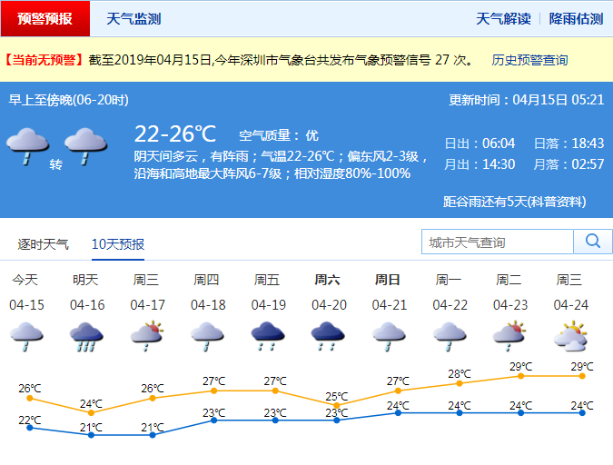 深圳新闻网2019年4月15日讯 记者从市气象局了解到,15日我市有阵雨或雷阵雨,16日白天有大雨到暴雨,并伴有短时大风、雷暴和短时强降水。提醒市民,强降水时请注意远离河道、低洼处等危险区域。