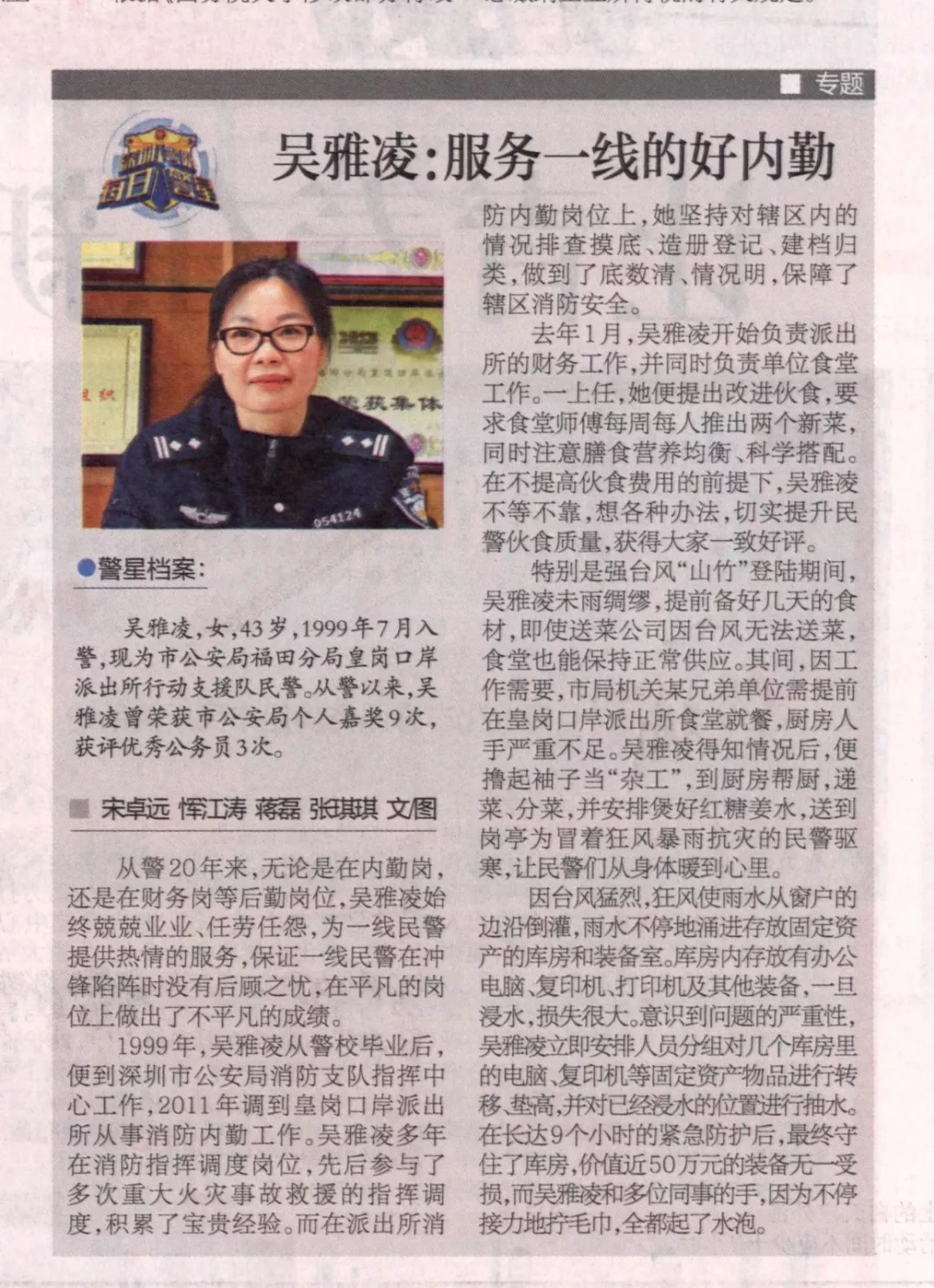 吴雅凌,女,43岁,1999年7月入警,现为市公安局福田分局皇岗口岸派出所行动支援队民警。从警以来,吴雅凌曾荣获市公安局个人嘉奖9次,获评优秀公务员3次。