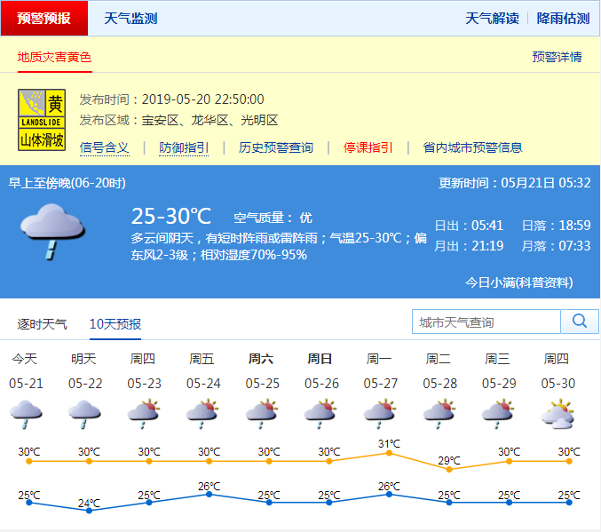 深圳市气象台自5月20日19时50分起,先后在全市陆地和海区发布雷电和暴雨黄色预警,并在光明、宝安和龙华发布暴雨橙色和红色分区预警,这是今年首次发布暴雨红色预警。本次降雨具有短时雨量大,持续时间短,雷暴密集等特点,5月20日19:00-5月21日00:00全市共记录到772次雷电。
