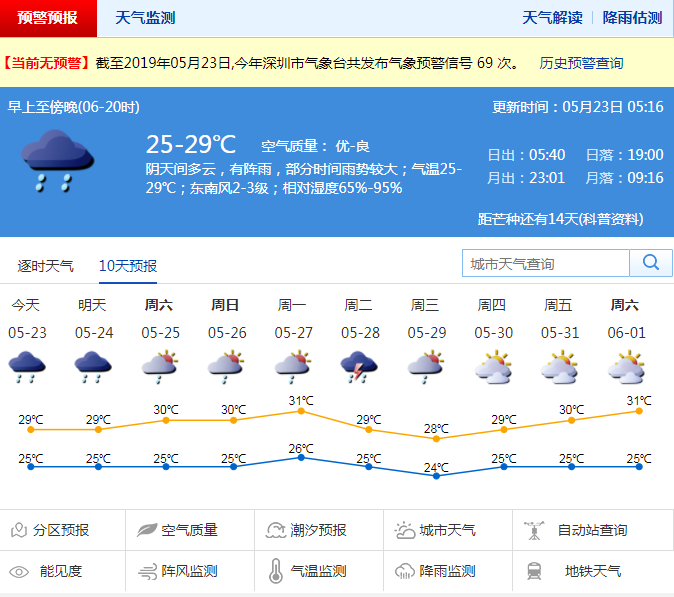 深圳新闻网2019年5月23日讯 21日夜间至22日白天,宝安、光明和南山出现大雨,其他地区出现小雨。预计今明两日我市阴天到多云,有中到大雨,局部暴雨;25-27日多云为主,有短时阵雨或雷阵雨;28日有雷阵雨;29日多云有短时阵雨。