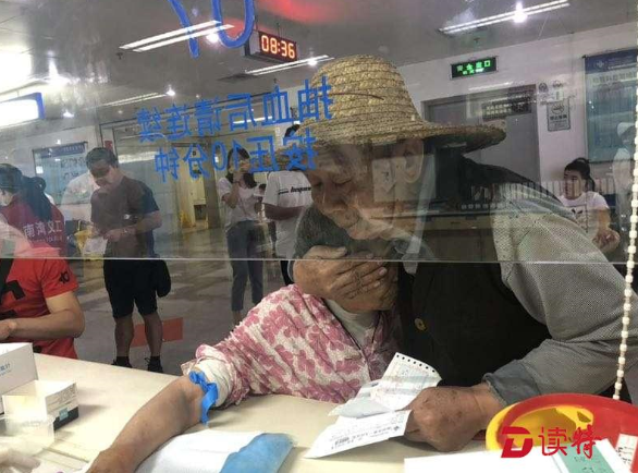 一名七旬老人陪老伴抽血检查时,因为担心其晕血,老人贴心地拥抱老伴,还捂住其眼睛不让其看抽血。