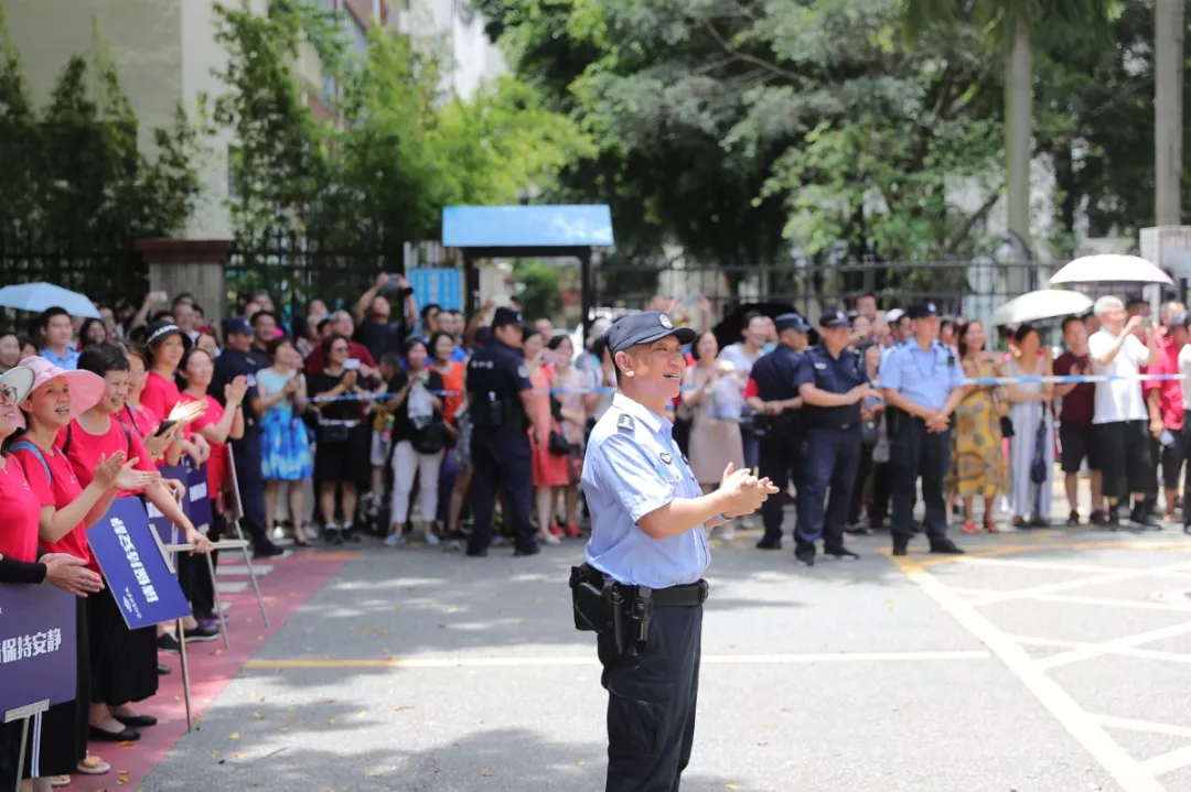 △当第一位考生走出深圳实验学校中学部考场时,通心岭派出所所长林志强与现场家长为其鼓掌喝彩。