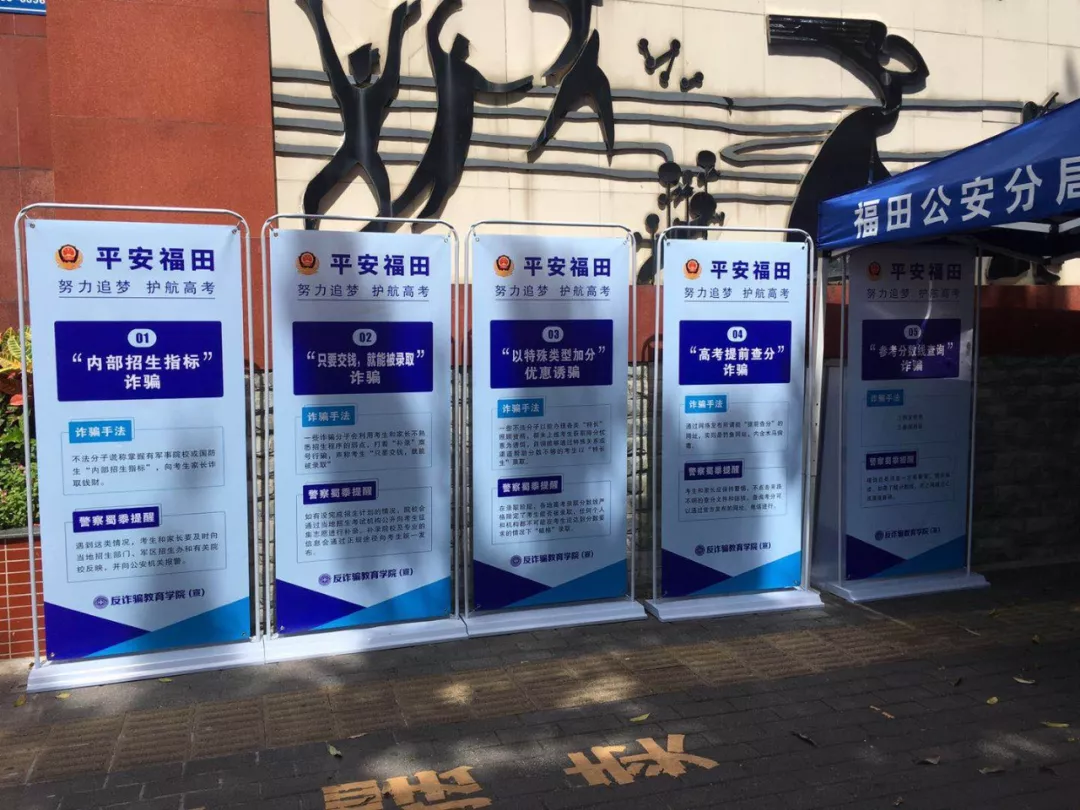 高考结束后,与高考相关的一些诈骗也进入了活跃高峰期。福田分局制作了高考反诈骗相关展板,在全区范围内的6个考点出入口显眼处摆放,提醒告诫考生及家长注意高考相关诈骗手法。