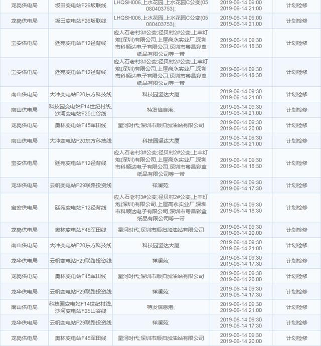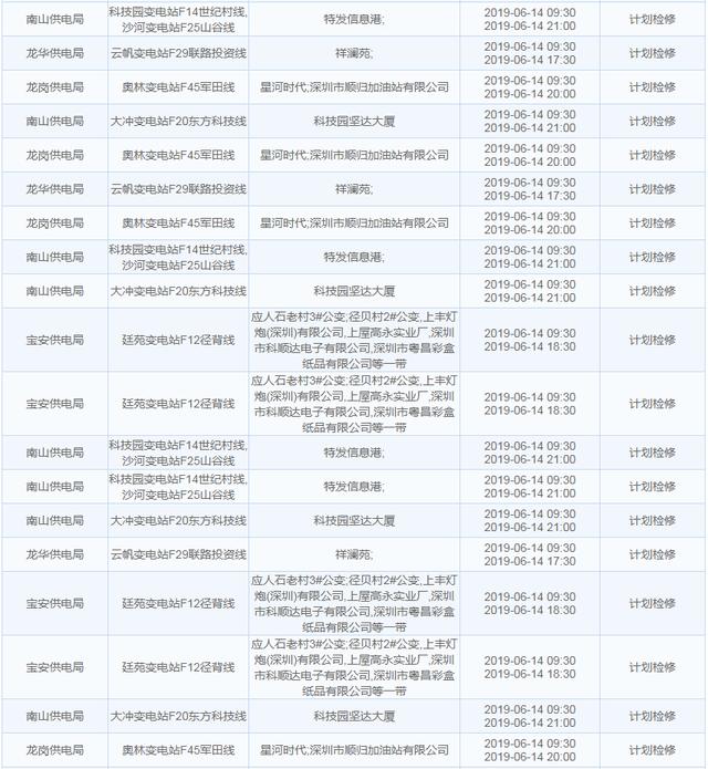 南方电网发布6月13日至6月16日深圳停电计划 涉及多个区