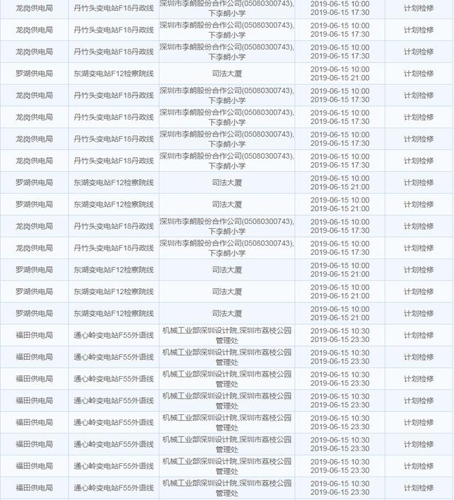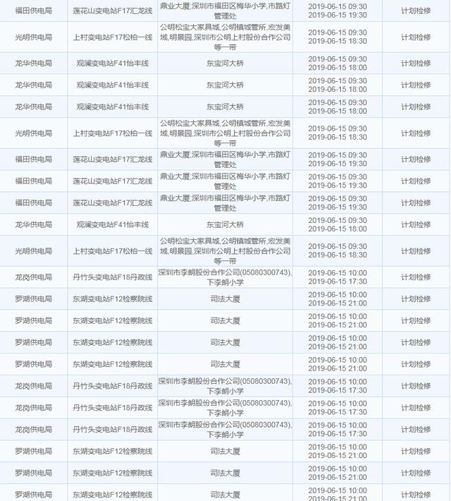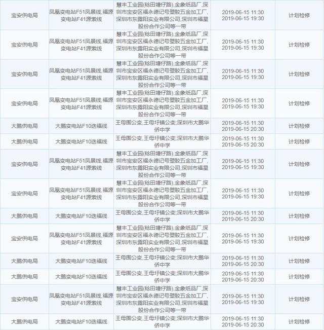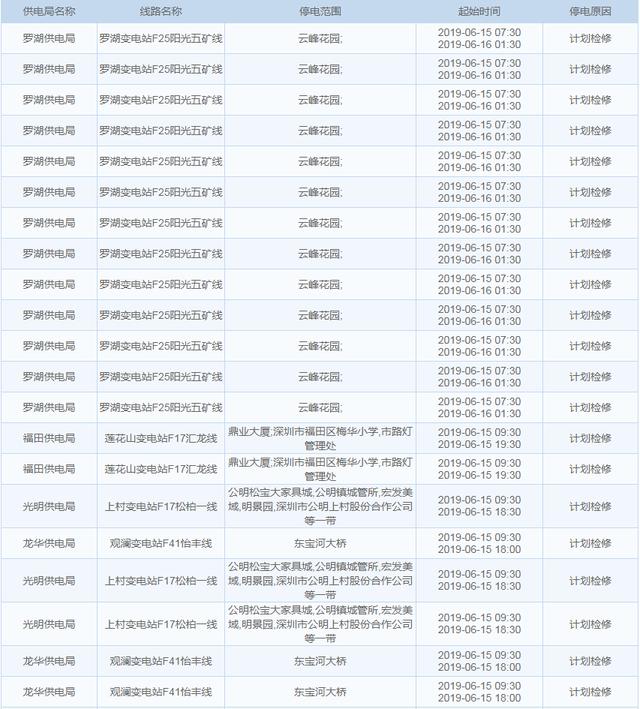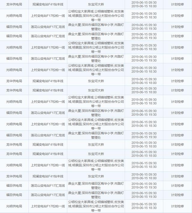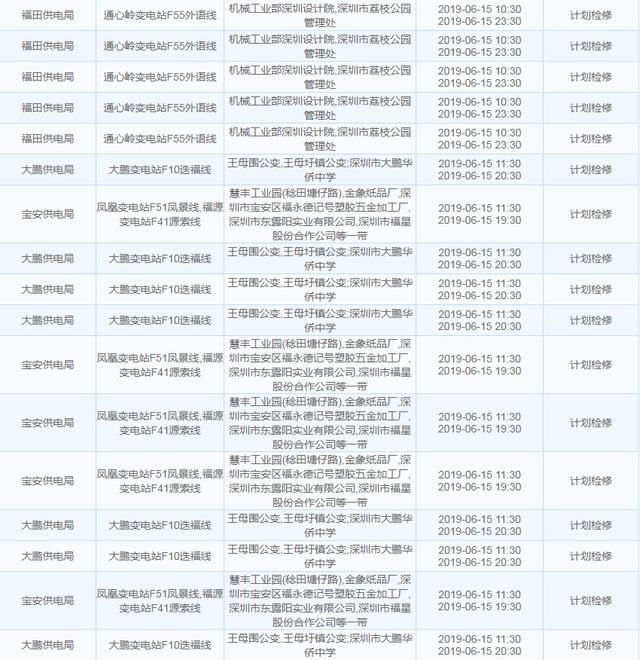 南方电网发布6月13日至6月16日深圳停电计划 涉及多个区