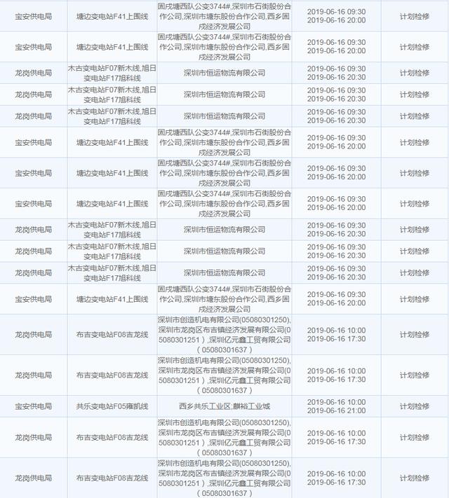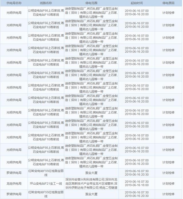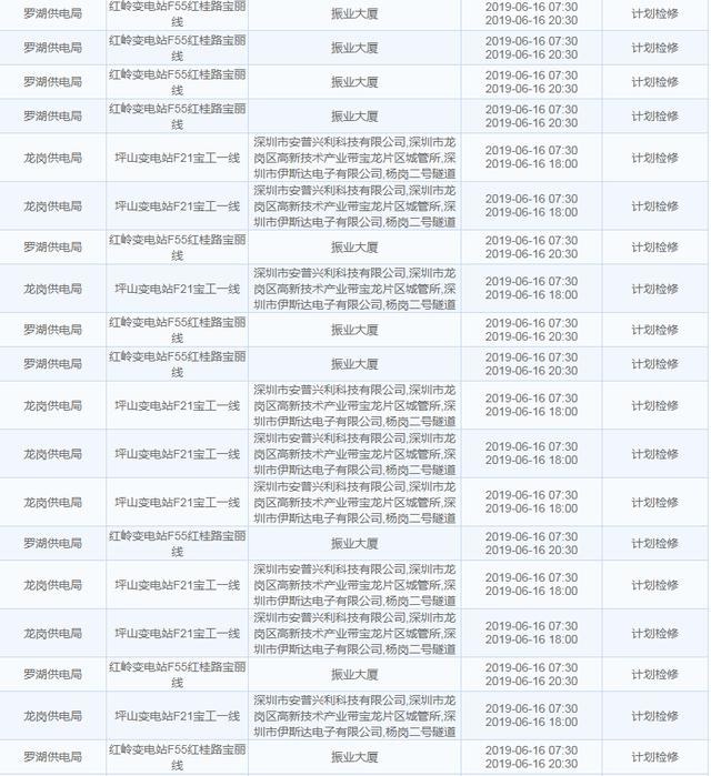 南方电网发布6月13日至6月16日深圳停电计划 涉及多个区