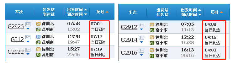 深圳前往昆明、南宁的车次少得可怜,但从广州去的多呀!
