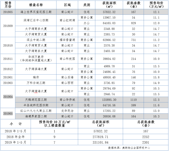 深圳预售均价10万元/㎡以上的楼盘(2018.1-2019.5)