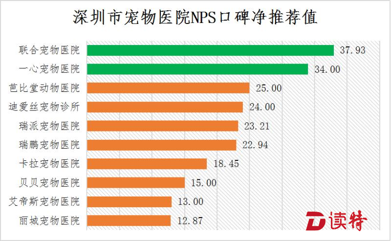近日,深圳市品质消费研究院在福田区消费者委员会和宝安区消费者委员会指导下,对深圳市13家宠物医院进行消费者NPS口碑调查。调研结果显示,被调查的深圳市13家宠物医院NPS口碑净推荐值平均为18.94。前三名为联合宠物医院37.93、一心宠物医院34.00、芭比堂动物医院25.00。