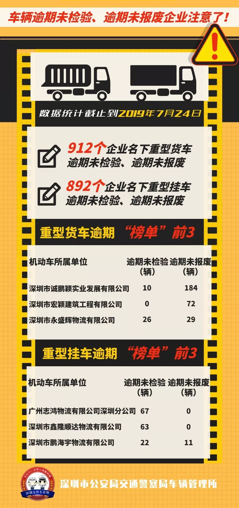 见圳客户端·深圳新闻网2019年7月26日讯(见圳客户端 深圳新闻网记者 何畅)车辆逾期未检验、逾期未报废,存在着重大交通安全隐患,深圳部分企业不重视安全管理、名下有大量“问题车辆”未处理。7月26日“深圳交警权威发布”微信公众号就对相关企业进行了点名曝光。