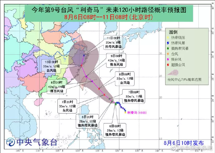 预计,“利奇马”将以每小时5公里左右的速度缓慢向西北方向移动,强度逐渐增强,最强可达台风级或强台风级(12-14级,35-45米/秒),逐渐向我国东南沿海靠近。未来两天对我国近海海域无影响。