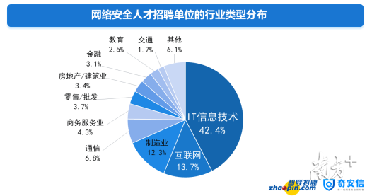 从用人单位的所属行业来看,IT信息技术和互联网行业对网络安全人才需求量明显高于其他行业,分别占到了总量的42.4%和13.7%。需求排名第三的是制造业,招聘数量占比12.3%。通信行业(6.8%)、商务服务业(4.3%)等排在其后。