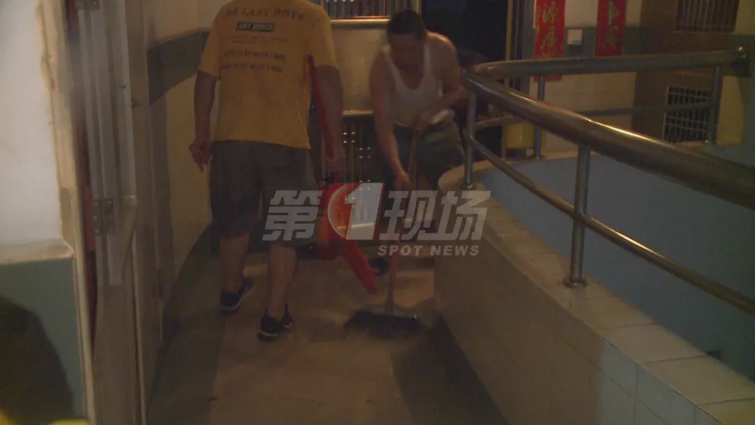物业管理处人员正在清理楼道积水