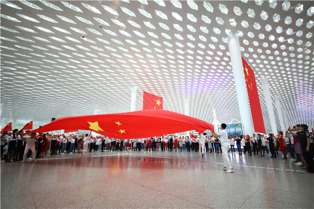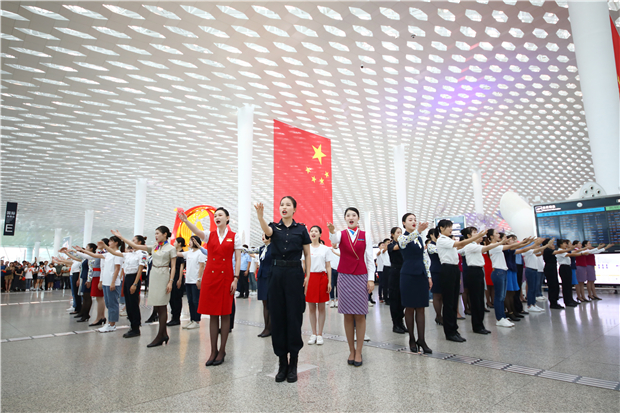 见圳客户端·深圳新闻网2019年9月17日讯(见圳客户端、深圳新闻网 记者 涂胜 通讯员 叶丹)为庆祝中华人民共和国成立70周年,9月17日,深圳机场联合深圳空管站、机场海关、边检、公安及各航空公司,在深圳机场航站楼出发大厅、地面交通中心、国内候机区等区域举办“乐动空港歌唱祖国”演出活动。当天,共有200余人次参加现场演出。活动现场,五星红旗飘扬,航站楼内汇成一片红色的海洋。