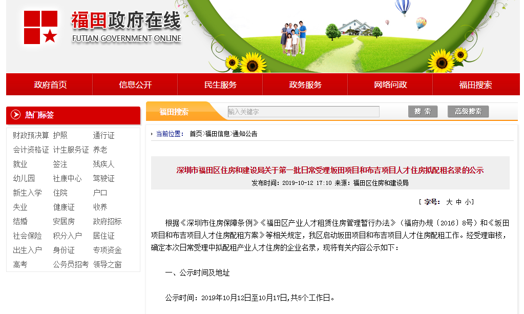 晶报2019年10月15日讯 记者从福田政府在线官网了解到,福田区第一批日常受理坂田项目和布吉项目人才住房拟配租名录公示啦!共72家公司进入名录。此外,福田区还有1600套住房15日起开始配租,房源选完即止!