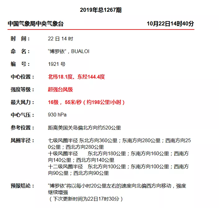 今年第21号台风“博罗依”已于10月22日凌晨加强为强台风级,早晨5点钟其中心位于美国关岛北偏东方向约370公里的西北太平洋洋面上,就是北纬16.7度、东经145.5度,中心附近最大风力有14级(42米/秒),中心最低气压为955百帕,七级风圈半径180-280公里,十级风圈半径100-160公里,十二级风圈半径50-80公里。
