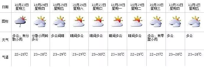 10月23-24日云量增多有分散小雨:23日云量增多,有分散小雨,24日分散小雨转多云,最低气温21-22℃、最高气温27-28℃;25-29日多云到晴,空气干燥。