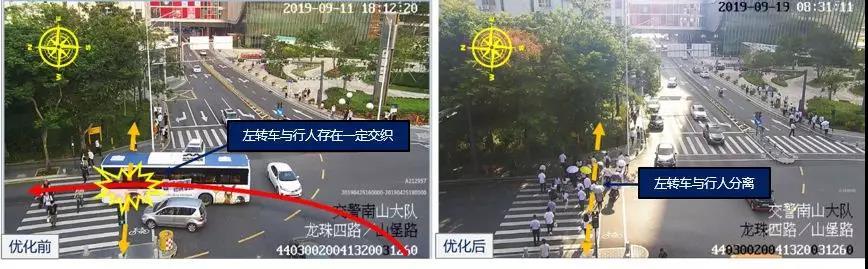 对此,深圳交警于9月11日对该路口进行再优化,调整东西向机动车放行方案,分离北面行人与西面左转车,从而保障北面行人过街安全。优化后,该路口东西行行人与同向左转车分离,行人过街安全更有保障。