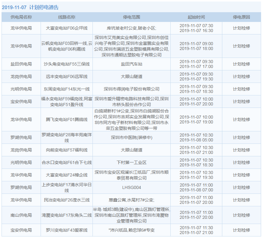 11月1日-15日,深圳这些地方将停电(附全名单)