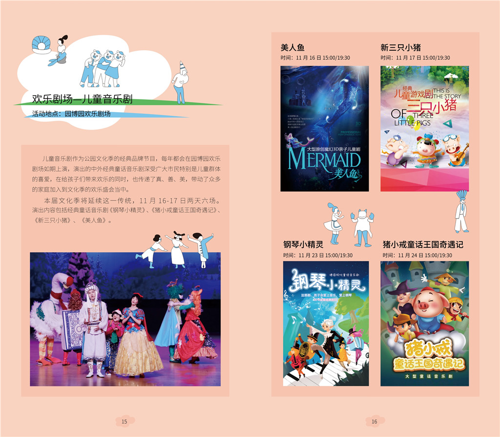 儿童音乐剧是公园文化季的经典品牌节目。11月16日、17日每天3场儿童音乐剧在园博园欢乐剧场举行,表演中外经典童话音乐剧。