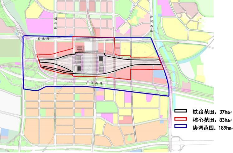 本次方案征集任务分核心区和协调区两个层面。核心区面积约83ha(下图红色线范围),本次方案征集需完成核心区范围的建筑概念设计;协调区包含核心区,总面积约189ha(下图蓝色线范围),本次方案征集需完成协调区范围的概念性城市设计;如有必要,可不限于此范围。
