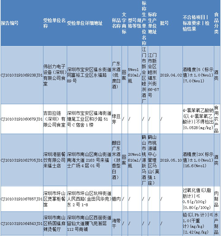 见圳客户端 ·深圳新闻网2019年11月6日讯 11月5日,深圳市市场监督管理局发布2019年第四十期食品安全抽样检验情况通报,通报称,深圳市市场监督管理局于2019年8-9月组织对我市餐饮环节的食品开展了抽样检验工作,本次共抽检餐饮环节食品671批次,涉及餐饮环节经营主体584家次,共检测食品指标3385项次。其中检出不合格样品12批次,涉及不合格食品类别有酒类2批次均为米酒;肉制品2批次为腊肉和腊鸭腿;食糖1批次、食用农产品5批次牛蛙、猪肝等在列;蔬菜制品1批次、水产制品1批次。