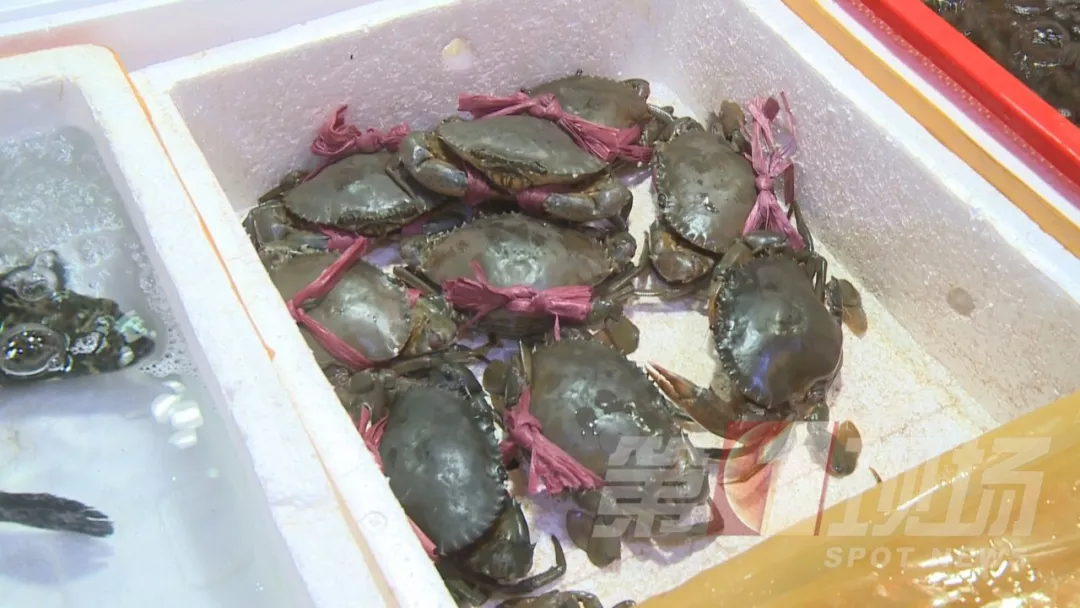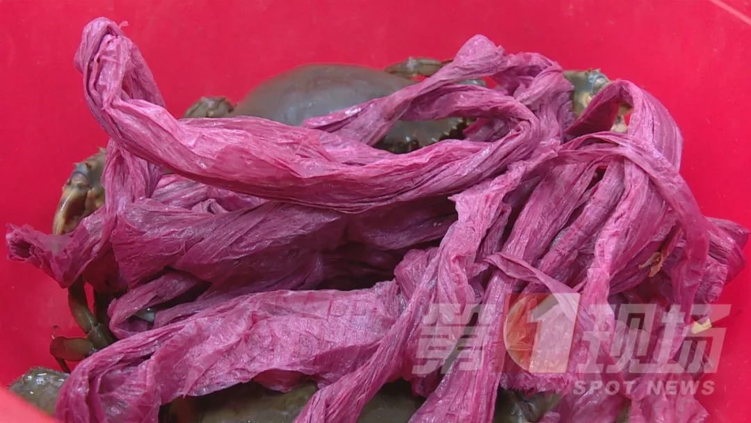 记者走访另一家店铺,同样没有发现绑粗红绳的膏蟹。店家表示,水产市场里卖的膏蟹,是一筐筐从台州运来直接批发售卖,运来时绑的都是白色塑料绳。