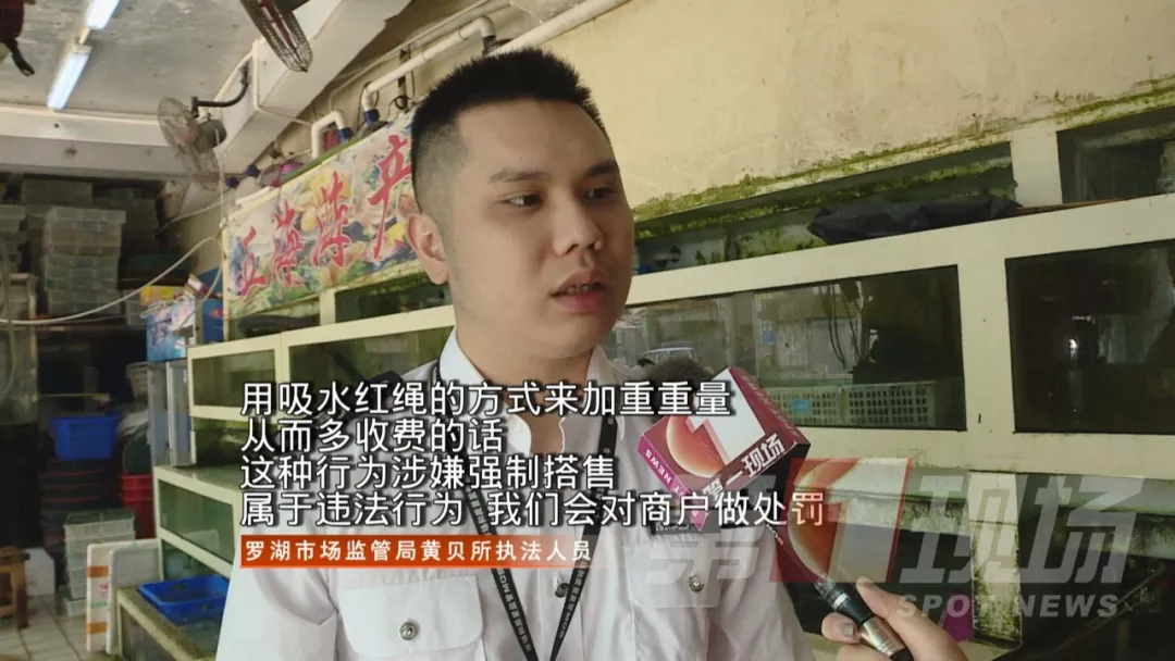 罗芳水产批发市场商家承认,的确有一些进货商为了盈利,会要求他们帮忙把红绳绑上去,或者自己将红绳加上去的情况,那这一行为是否合规?记者联系了辖区市场监督管理局的执法人员到现场。