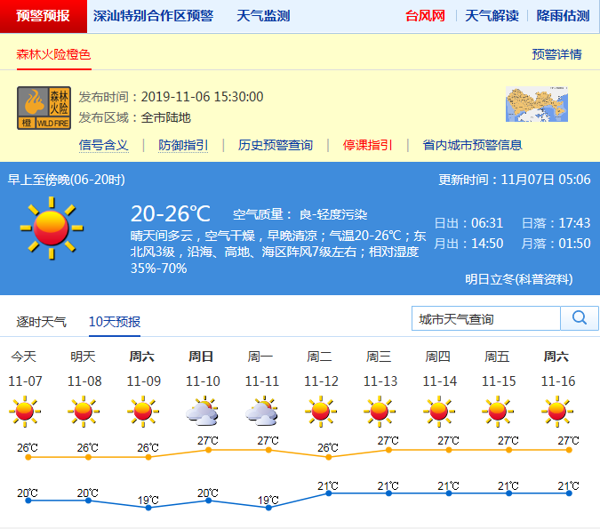 见圳客户端·深圳新闻网2019年11月7日讯 空气非常干燥,沿海及高地阵风7级左右,气温20-26℃。未来几天干燥加剧,请注意用火安全,户外运动需及时补充水分。