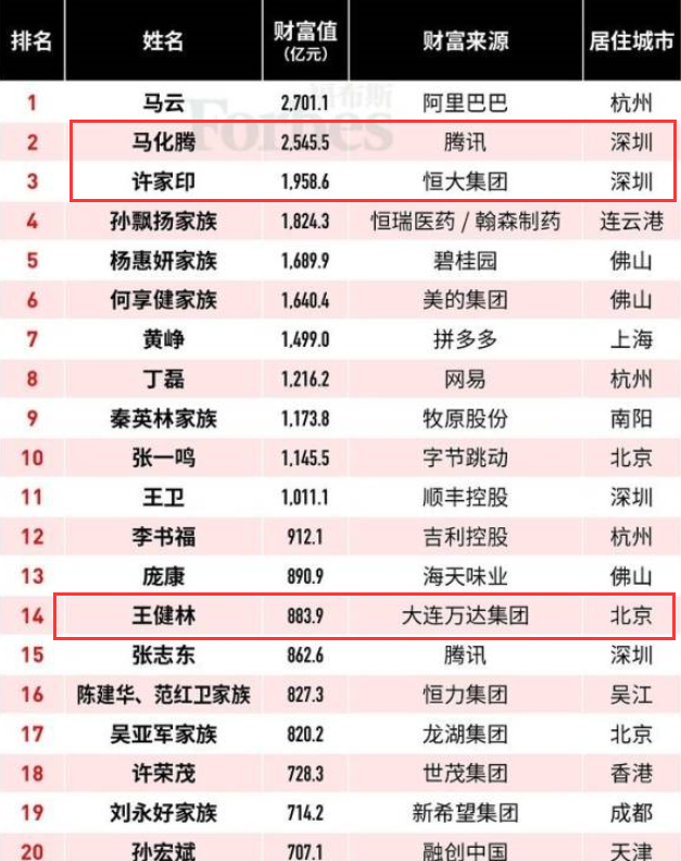福布斯发布2019中国富豪榜,马云马化腾许家印前三,王健林从去年的第4位跌至第14位