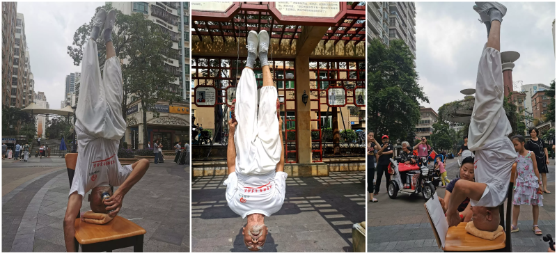 倒立喝水、倒立吊环、倒立写字…无一不能
