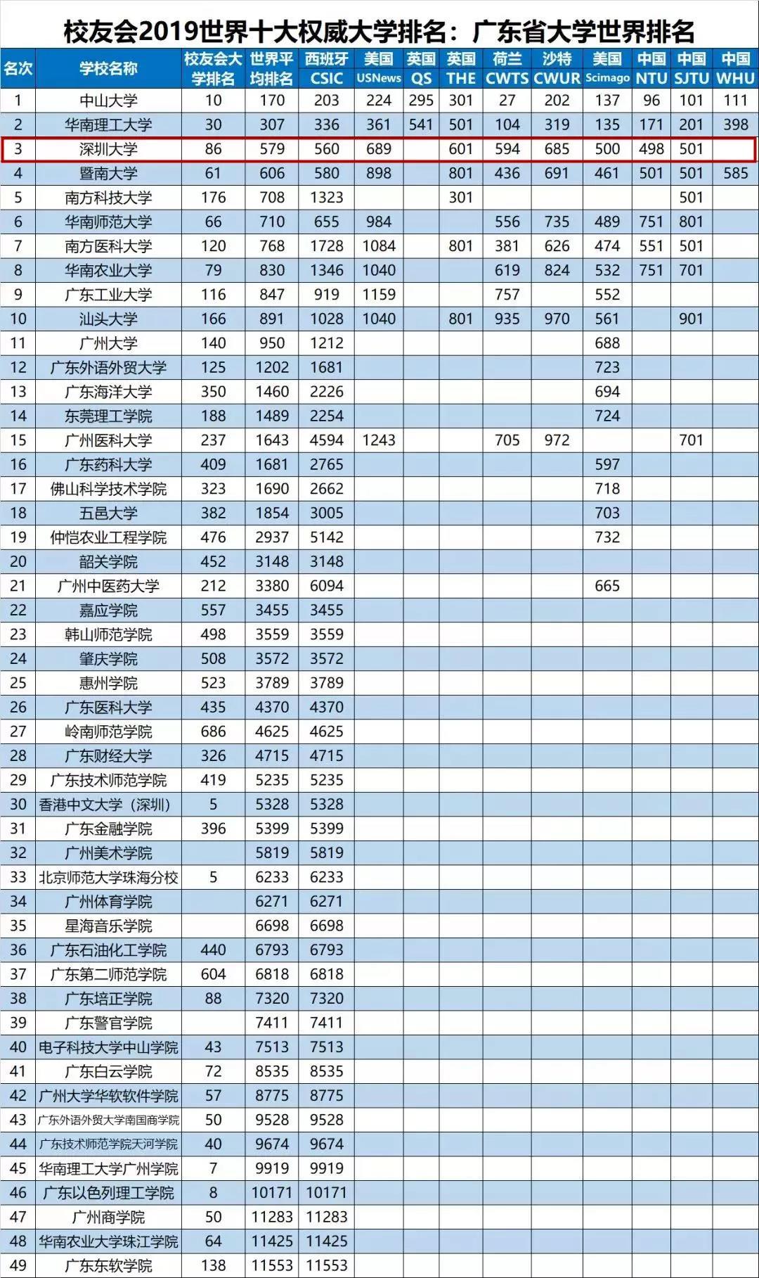 报告显示,在全球公认的英国QS、英国THE、美国USNews、美国Scimago、西班牙CSIC、荷兰CWTS、沙特CWUR、中国NTU、中国SJTU和中国WHU等2018-2019世界十大权威大学排名中,中山大学、华南理工大学、深圳大学名列2019广东省大学排名前3强。