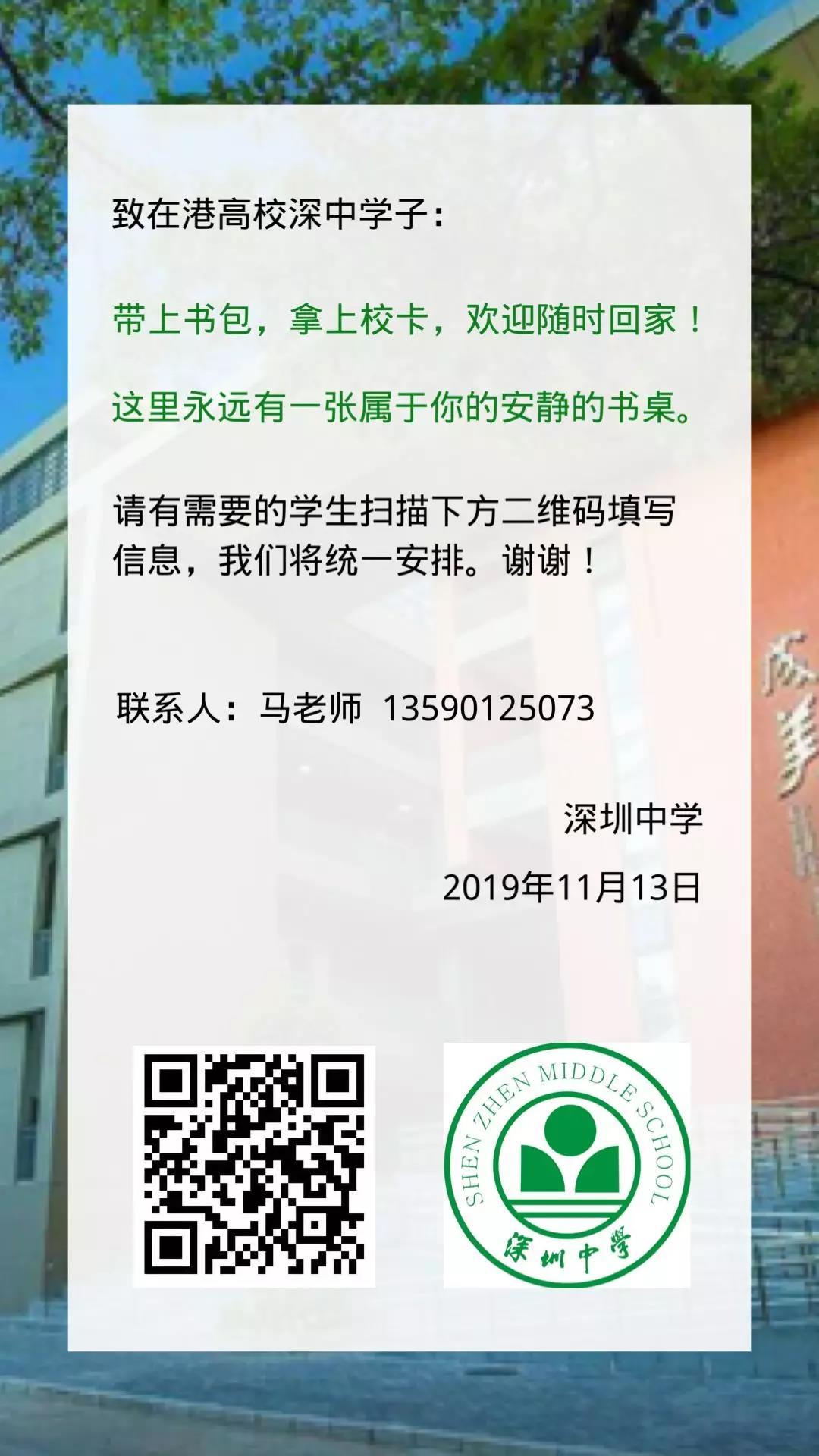 见圳客户端·深圳新闻网2019年11月14日讯 继香港中文大学(深圳)发文表示为内地在港就读学生提供临时免费住宿后,深圳中学今天也在官方微信公号中致信在港高校深中学子,只要拿上校园卡,深中随时欢迎学子们回家!学校将对有需要的学生统一进行安排。