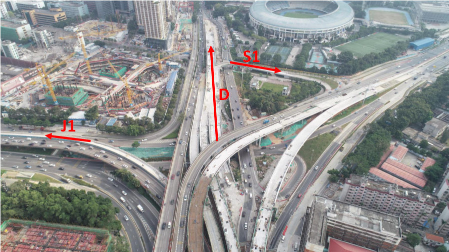 泥岗立交J1 (北环大道转泥岗东路东行)匝道桥由三车道转成四车道;泥岗立交D (北环大道转上步北路南行)匝道桥由原来一条匝道桥新增至四条匝道桥,泥岗立交S1 (上步北路南行转泥岗西路)匝道桥新增了两条匝道桥, J1、D、S1匝道桥预计将于今年12月初开放通车。