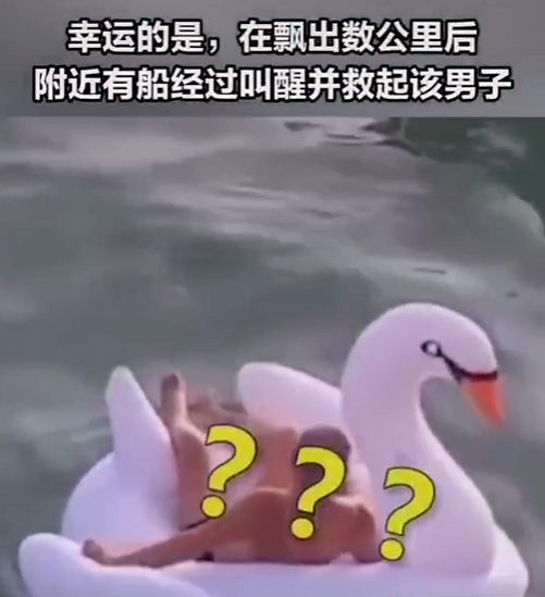 最近,有个视频很火。视频中标注:一男子在深圳鹿嘴山庄游玩时,躺在天鹅气垫上睡着了,涨潮后被带出海飘走,在飘出数公里后他被经过的船叫醒并救起。