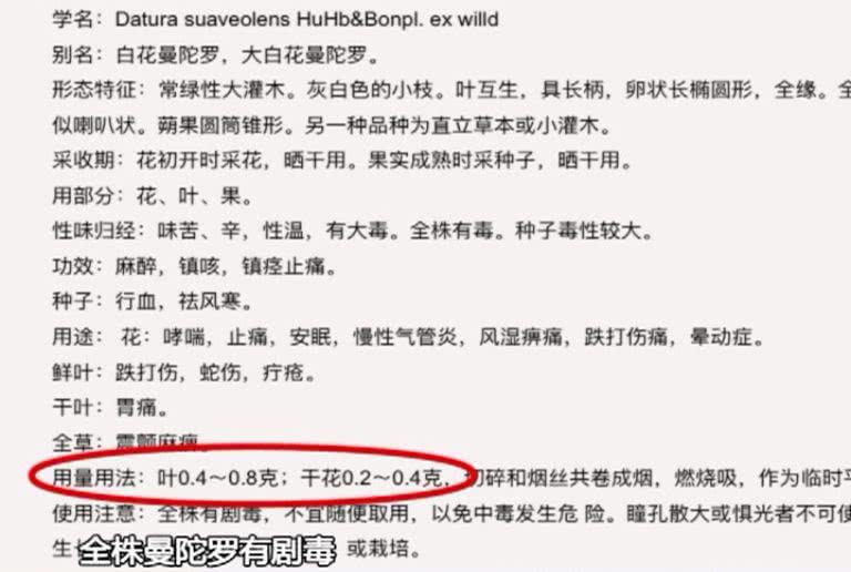 据了解,曼陀罗又名洋金花,有一定的药用价值,但也有毒理作用,有多例报道介绍过曼陀罗致人中毒事件。据相关资料显示,曼陀罗叶应用药0.4克至0.8克,干花用药0.2克至0.4克,使用注意事项提及到,全株曼陀罗有剧毒,不宜随便取用,以免中毒发生危险。