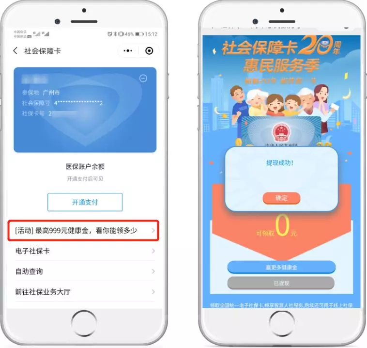 绑定电子社保卡后,可通过社保卡详情页,回到活动首页,点击“提现到零钱”,马上提现。