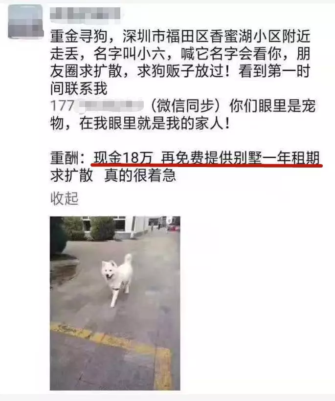 近日,深圳有位狗主人在朋友圈寻狗,重酬的内容是:现金18万+一年别墅使用权