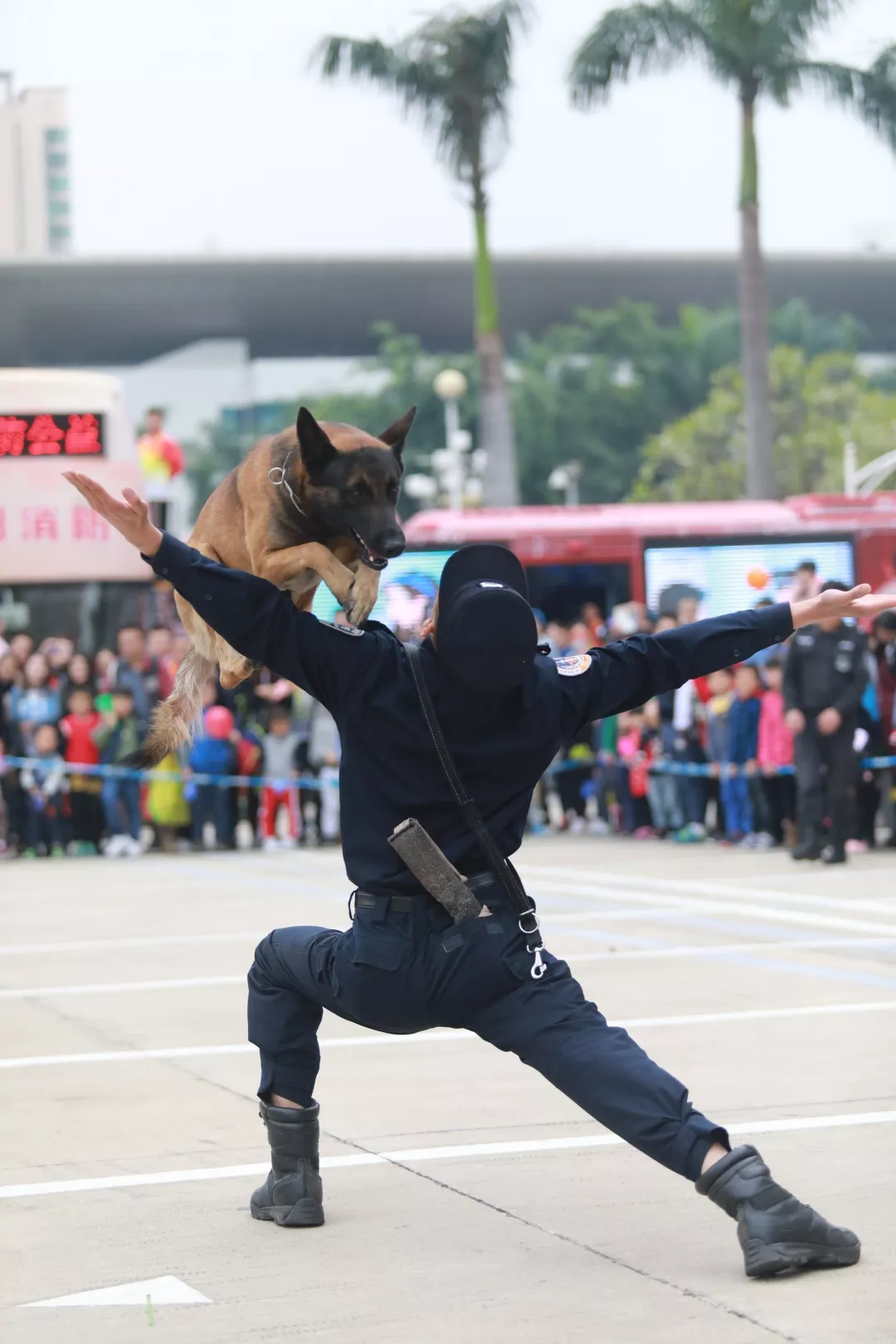演出科目:跳跃人体障碍、实战扑咬、箱包搜索、解救人质、跳火圈等