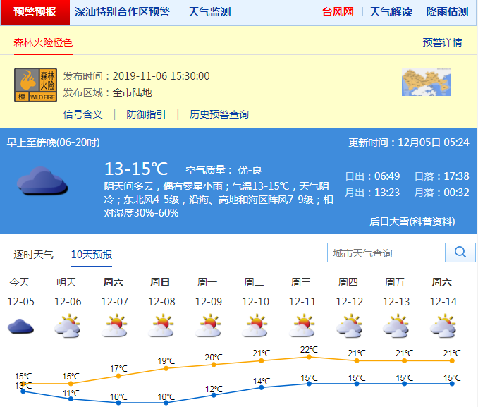 全市森林火险橙色预警信号生效中,其中深汕区森林火险红色预警和寒冷黄色预警信号生效中。