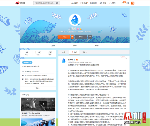 见圳客户端.深圳新闻网2019年12月6日讯(见圳客户端、深圳新闻网记者 张玲)2019年11月30日,据梨视频报道,互联网筹款平台“水滴筹”在超过40个城市的医院派驻地推人员,线下地推服务人员被指在医院“扫楼”寻找求助者,套用模板,随意填写金额,不审核甚至隐瞒求助者财产状况,鼓励患者大量转发筹款信息。同日,水滴筹通过微博官方认证公众号回应称,已第一时间成立紧急工作小组开展相关情况排查,同时线下服务团队全面暂停服务,整顿彻查类似违规行为,并对梨视频报道可能引发的误解进行了3点说明。