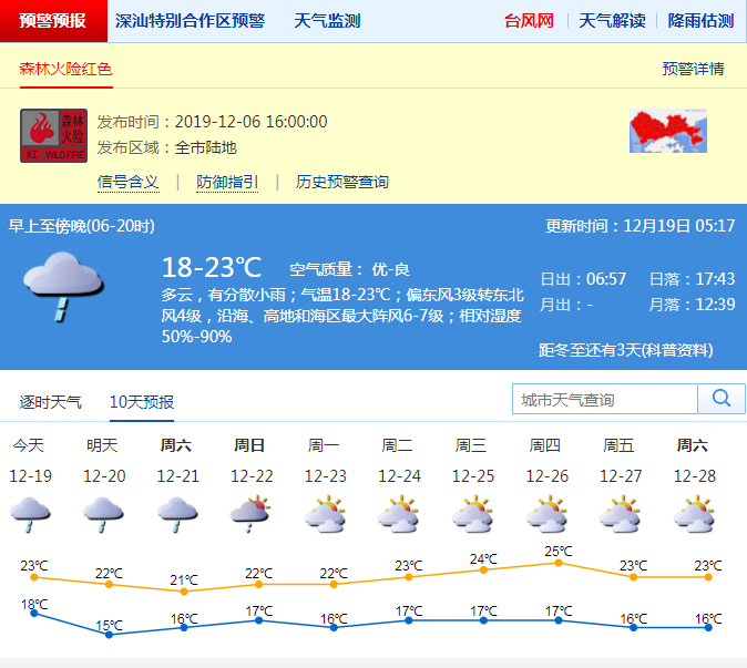 见圳客户端·深圳新闻网2019年12月19日讯 深圳市气象局预计18日夜间至21日冷空气影响,转阴天,有分散小雨,沿海、高地和海区阵风6-7级,气温下降,20日最低气温15℃;22日午后转多云,23-25日可见阳光,气温回升。