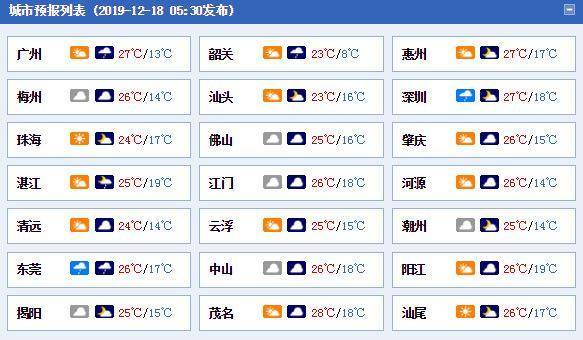 18日起三天,中等强度冷空气逐渐自北向南影响广东,天气转为阴冷,北部市县有小雨局部中雨(日平均气温下降6~8℃),中部市县有小雨(日平均气温下降4~6℃),南部市县有分散小雨(日平均气温下降3~5℃),陆地风力逐渐转为偏北风3-4级阵风5级,高海拔或高地风力可达4-5级阵风6级。