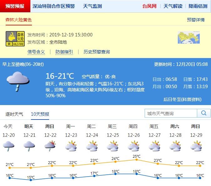 见圳客户端·深圳新闻网2019年12月20日讯 从18日夜间到19日下午,我市阴天,早晚有轻雾和分散小雨,白天最高气温介于20-23℃之间。森林火险红色预警信号已降级为黄色。