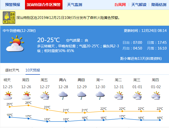 见圳客户端·深圳新闻网2019年12月24日讯 今日多云,可见阳光,有轻雾或霾;气温20-25℃;东风2-3级;相对湿度55%-90%;25-26日多云,有轻雾或霾,白天温暖;26日夜间至27日冷空气影响,风力加大,沿海、高地和海区最大阵风7级左右,气温下降,天气转凉;28-30日云量增多,有一次降水过程。